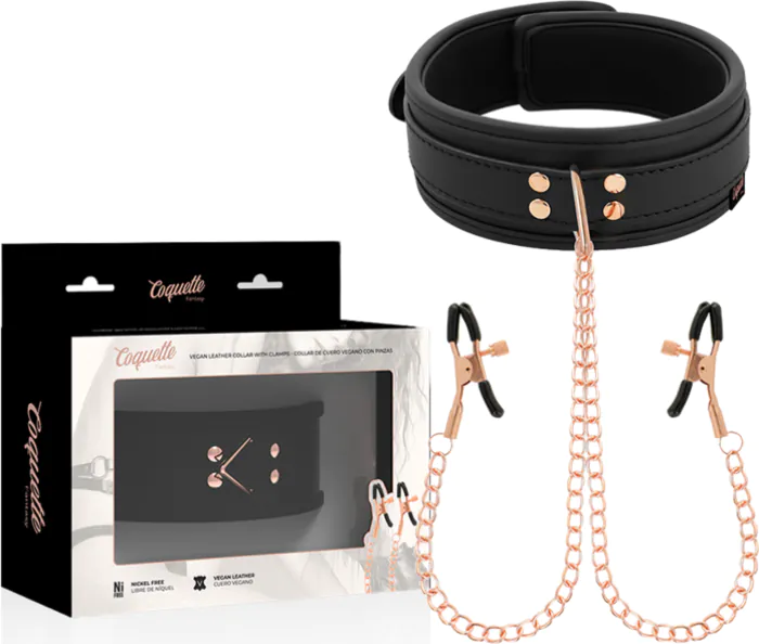 Kolárik COQUETTE FANTASY Chic Desire kombinuje pohodlný vegánsky kožený materiál s pinzietami na bradavky. Ideálny pre začiatočníkov a nadšencov BDSM.