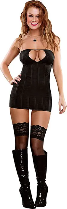 Prebuďte zvodnosť s bezramienkovým šatníkom Keyhole Chemise od Exposed. Jeho krátky a odvážny dizajn spolu s jemnou čiernou látkou s reliéfnymi pruhmi vás urobí neodolateľnou. Zapína sa pohodlne na chrbte, čo umožňuje odporúčané prispôsobenie.
