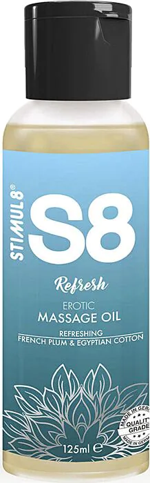 Tento masážny olej S8 Refresh je telový a intímny olej formulovaný na báze troch rastlinných olejov — jojoba, mandľa a sezam — a obohatený o vitamíny a minerály. Na pokožke to pocítite: poskytuje hlbokú hydratáciu a jemný finiš bez lepkavého pocitu. Je aromatizovaný (Refresh: francúzska slivka a egyptská bavlna) a prešiel alergickým testom, okrem toho je bez parabénov, ftalátov, lepku a cukru.
