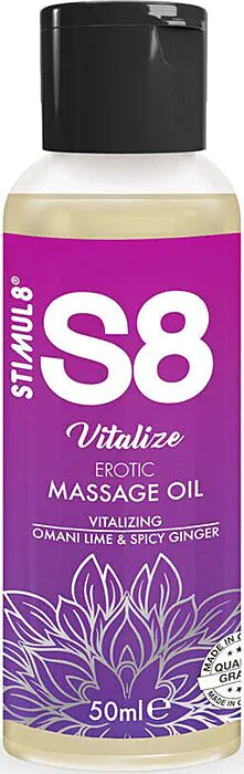 Olej na masáž STIMUL8 S8 Vitalize je navrhnutý na erotické masáže a starostlivosť o pokožku. Kombinácia oleja z jojoby, mandlí a sezamu poskytuje jedinečnú hydratáciu a jemnosť.