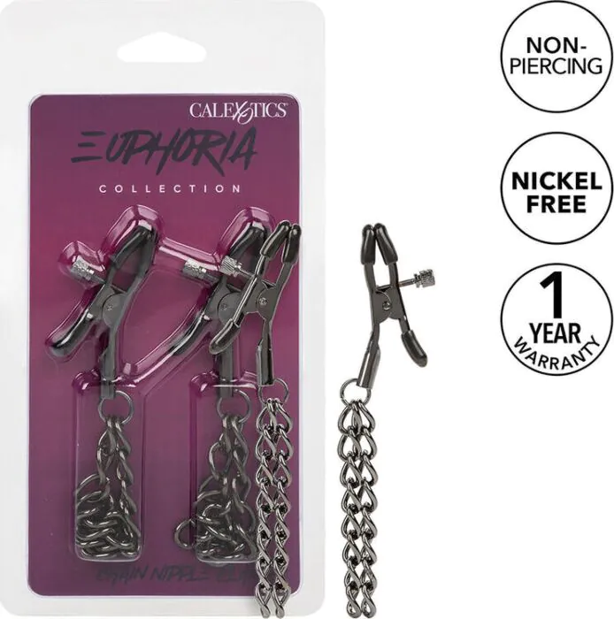 Intenzívna a prispôsobená stimulácia s pinzami na bradavky CALEXOTICS EUPHORIA, ktoré sú navrhnuté tak, aby spĺňali všetky vaše preferencie a priania. Mäkké podložky na pinzách poskytujú pohodlné uchopenie, pričom nastaviteľný reťazec zvyšuje vzrušenie pri každom pohybe.
