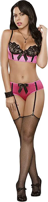 Súprava prádla s kombináciou čiernej čipky a ružového saténu. Komfortný strih ideálny pre začiatočníkov v sexy bielizni.